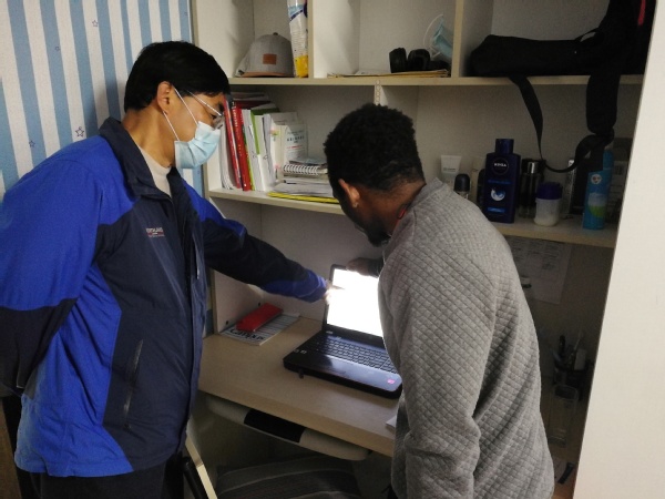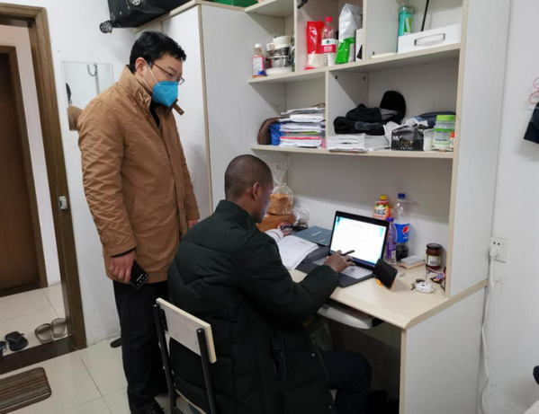 2月25日,网上开学第二天,国际教育学院院长金泉元、副院长李勇带领辅导员唐崟捷、杨定娟一起走进将军路校区学生宿舍,实地看望正在进行线上学习的国际学生们,了解学生的学习、生活情况和实际需求。