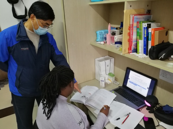 来自肯尼亚的西娅同学正在宿舍学习《综合汉语》课程。当金泉元院长问到她在线学习是否遇到困难时,西娅回答说:“我知道在这样特殊的时期,网课是最好的学习方式。汉语老师的网课讲解非常细致,同时也可以在线实时交流。我觉得学习很顺利。”