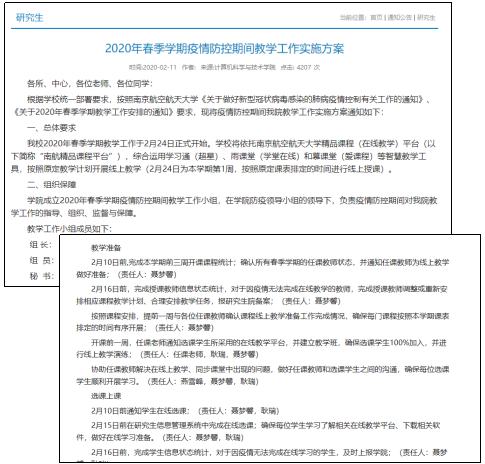 2月7日,学院组建了教学工作小组,根据“精细布局,责任到人”的原则,制定了《2020年春季学期疫情防控期间教学工作实施方案》,围绕课程教学、论文答辩、国际交流、学生管理四个方面对工作内容进行精准部署。在工作中确保不忽视任何细节,每个任务“完成时间明确,岗位职责到人”;确保不遗漏任何研究生,每位学生“任你天涯海角,关爱和叮咛每日准时送达”!