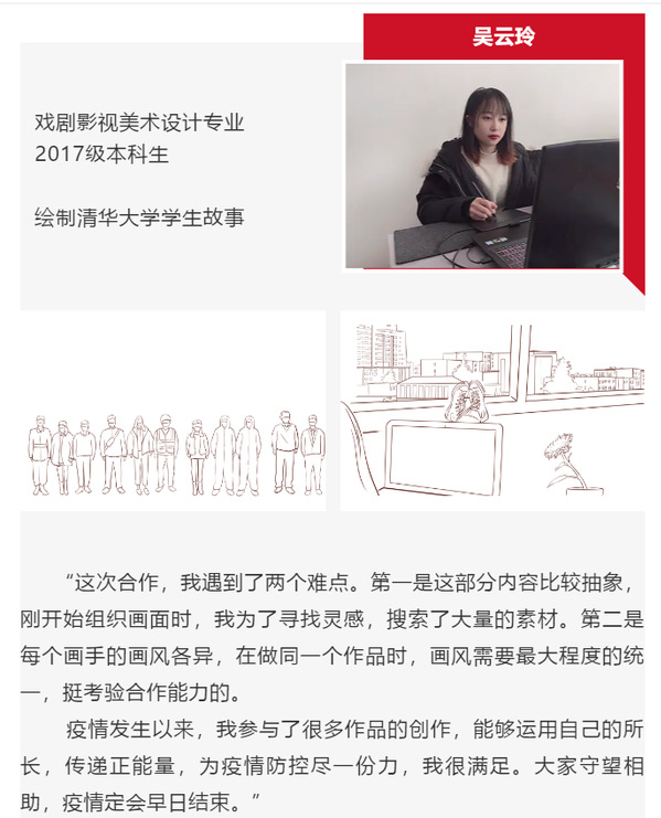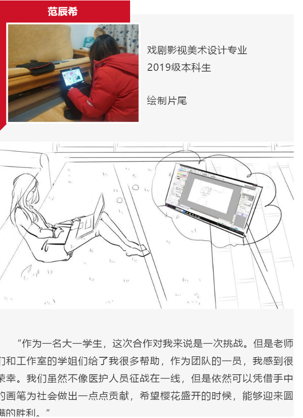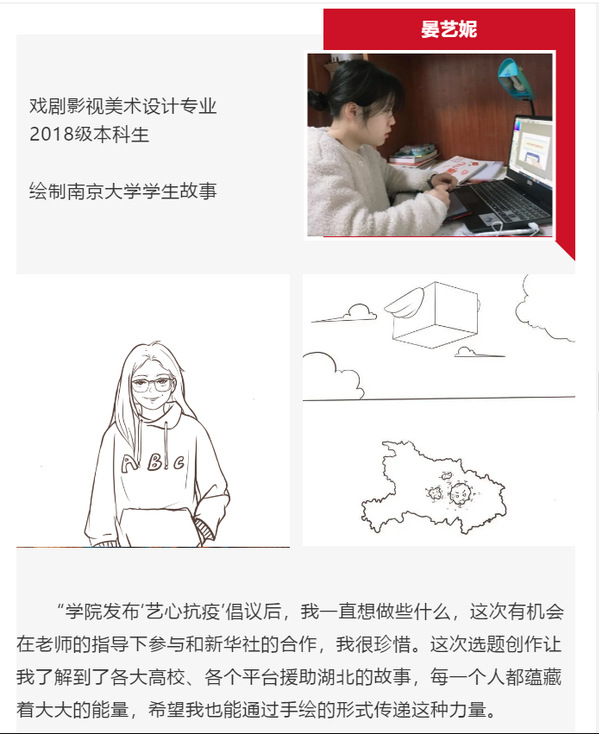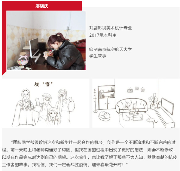 《温度·疫情下的屏幕一代》执行导演吴瑞宇对此次与艺致思政工作室的合作也给予了高度评价:“总结一个关键词是“高效”。首先,从策划到发布不到一周的时间,再加上因为疫情不能当面协商讨论,使得这次合作更显高效。同学们能够准确领悟策划意图,并出色地完成所分配的内容,表现出了过硬的技术本领。”此次参与手绘创作的5位女生,均为南航艺术学院艺致思政工作室成员。这次参与新华社的作品创作,对于她们来说是一次难忘的经历。