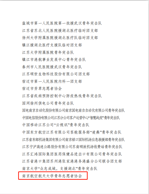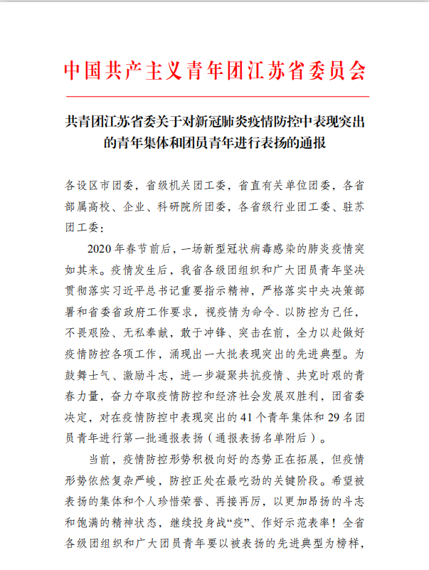 近日,共青团江苏省委发布了《关于对新冠肺炎疫情防控中表现突出的青年集体和团员青年进行表扬的通报》,我校青年志愿者协会名列41个受表扬的集体之中,我校也是首批获得表扬的仅有的两所高校之一。