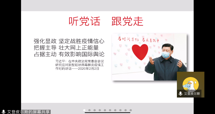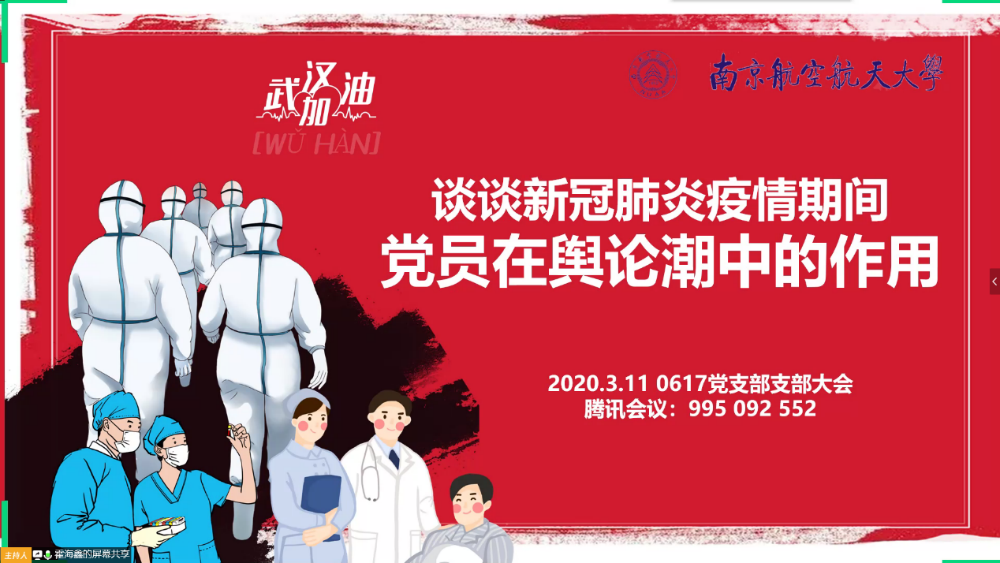 在这个特殊的春节里,新型冠状病毒疫情的爆发引发了全国上下的舆论关注。为了在纷繁复杂的舆论“漩涡”中,展现青年学生党员的理性之思、能量之声、榜样之行,3月11日晚,本着“组织生活‘线上过’,党员队伍‘不掉线’”的原则,材料学科与技术学院0617党支部召开了支部大会,学院党委副书记许赞及全体成员通过视频线上参会。