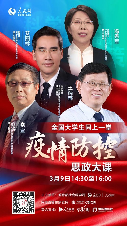 在举国上下众志成城、万众一心做好新冠肺炎疫情防控工作的特殊时期,3月9日,由教育部社会科学司、人民网联合举办的“全国大学生同上一堂疫情防控思政大课”通过网络直播的形式开课。此次“思政大课”邀请了清华大学马克思主义学院艾四林、中国人民大学马克思主义学院秦宣、北京师范大学马克思主义学院王炳林、中央财经大学马克思主义学院冯秀军四位教授结合思政课程的内容对党中央关于疫情防控的决策部署进行了深刻的解读。马院高度重视此次活动,统筹安排、克服直播拥堵困难,提前三天通过学院官网、微信等平台积极推广宣传,及时下发观看通知,鼓励思政教师组织学生统一观看、研讨。