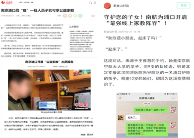 为响应团省委“子女守护计划”的倡议,校团委积极与浦口区政府联络,为浦口区抗疫一线工作人员子女提供线上公益家教服务。在浦口区政府支持下,通过与区教育局、部分街道团工委、浦口中心医院合作,自2月10日活动启动以来,服务人数达37人,覆盖学龄段从幼儿园大班到初中一年级,对接志愿者78人,累计服务时长超700小时。近日,该活动也得到了南京市主要领导的肯定和批示,并要求作为典型案例在各区推广。