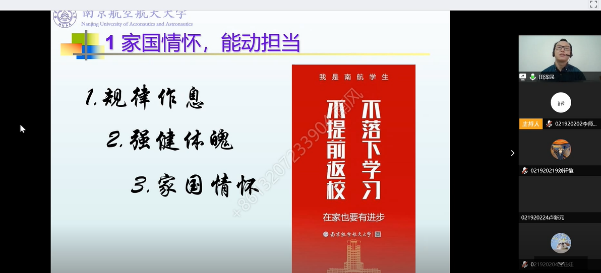 家国情怀、能动担当,思政教育有效果。“线上”班会中,班主任深刻把握疫情之下的思政教育元素,结合学校、学院的人才培养目标,对学生开展思想引领工作,鼓励同学们坚定理想信念,厚植爱国情怀,力争树立符合学院实际的“线上”课程思政品牌。其中,19级车辆工程专业班主任李舜酩老师解读了国家面对新冠疫情的应对措施,他认为中国的应急措施和相关政策是非常正确的,足以体现中国特色社会主义制度的优越性;16级飞行器动力工程专业班主任高希光老师认为疫情期间,坚持“宅”家是重要的防护要求,提醒同学们强化纪律,鼓励大家对战胜疫情坚定信心。