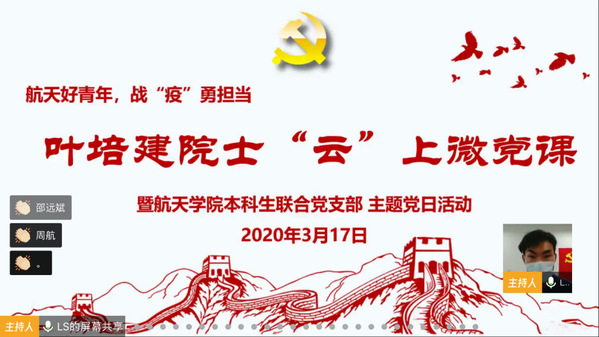 为深入学习贯彻上级关于疫情防控的重要指示精神和决策部署,充分发挥党支部战斗堡垒作用和党员先锋模范作用,3月17日下午,航天学院学生党支部举行叶培建院士云端“微”党课暨“航天好青年,战‘疫’勇担当”主题党日活动,航天学院院长叶培建院士、学院党委书记季海群等学院领导老师以及本科生联合党支部全体党员、研究生党员代表117人参加活动。