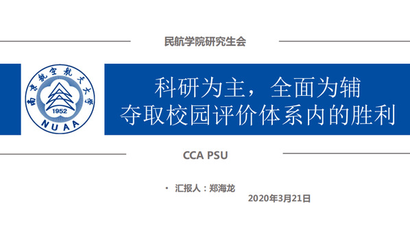 首先,郑海龙以 “科研为主,全面为辅,夺取校园评价体系内的胜利”为主题,解读了现有校园评价体系,展示了民航学院优秀毕业研究生量化考核表,并就表中的学习能力、工作能力、科研能力、思想表现等项进行了详细的介绍,为研究生阶段应重点加强的能力提出了建议。接着,他以自己参与国家奖学金答辩的经历为例,重点分享了答辩时的技巧和应注意的问题。郑海龙强调,答辩应避免形式花哨、无实质内容,注重扬长避短,突出自己的特色和优势。
