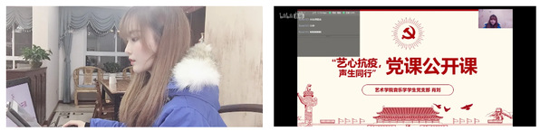 肖刘是音乐学学生党支部的一名党员,她结合自身专业特色,以《艺心抗“疫”,声生同行》为主题,讲述了战“疫”文艺工作者们的优秀事迹,全面展示了在全国抗“疫”时,后方的文艺工作者们所做的努力。而学院的多名音乐表演专业同学也投身歌曲创作,为英雄们演唱抗疫战歌,创作了《我说》《看见》《庄严的承诺》等,通过音乐传达浓浓的爱国情,强国志。文艺的力量既是温暖的,也是震撼心灵的。“我们作为当代青年大学生,作为艺术学子,在疫情中应当用文艺的力量,为战斗在前线的英雄们加油打气!”,她鼓励大家积极发挥党员的先锋模范作用,学好专业本领,做优秀的文艺工作者,创作更多有温度的文艺作品,彰显了中国精神,凝聚了中国力量。