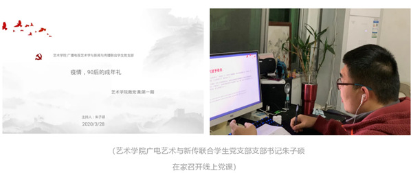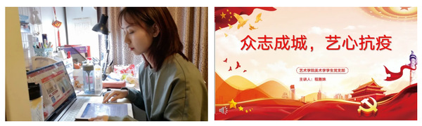 在新冠疫情防控特殊时期,艺术学院学生党支部扎实落实“三会一课”制度,根据艺术学院《关于在疫情防控期间加强党支部组织生活的通知》的要求,进一步加强疫情期间党支部组织生活,切实发挥基层党组织的战斗堡垒作用。各党支部利用腾讯会议或哔哩哔哩直播等线上平台,面向党员和培养对象开展了云端战“疫”系列微党课,深入挖掘战“疫”中蕴含的思想政治教育资源,把疫情危机转化为党员教育契机,在学生中产生了积极影响。学院党委副书记王宇宁老师、各位辅导员老师、组织员、教工党支部书记均全程参加了支部党课。教工支部书记还对学生支部的党课进行了点评。党员、入党积极分子,通过观看直播、笔记分享、线上讨论等方式,积极参与其中。在学习通在线学习平台,共反馈245份学习笔记。