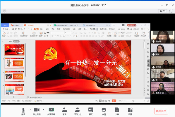 3月30日晚,电子信息工程学院SX1804第一党支部举行“有一份光、发一份热”线上党日活动。本次党日活动从学习在战疫情中优秀的共产党员到分享志愿经历,支部各个成员受益匪浅。在以习近平同志为核心的党中央坚强领导下,举国上下同时间赛跑、与病魔较量,党员干部冲锋在前,与人民群众心手相连,共渡难关。