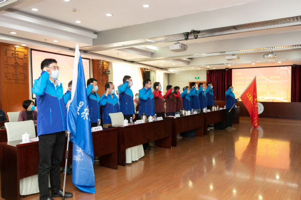 宋迎东为研制团队授队旗和支部旗。试验队队长王寅、党支部书记陈传志郑重从宋迎东手中接过大旗。在旗帜掩映中,全体试验队员庄严宣誓。