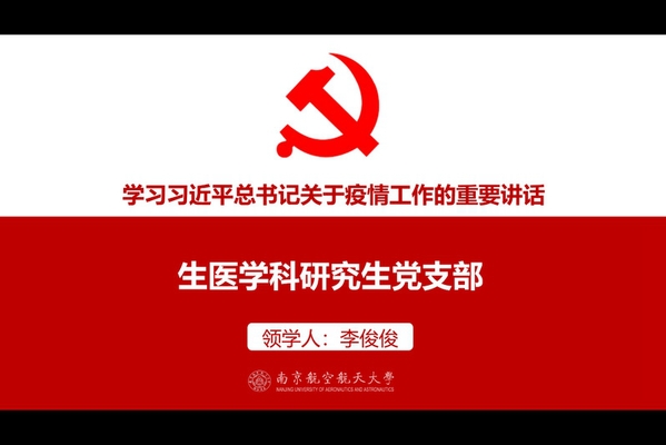 为贯彻中央《关于加强党的领导、为打赢疫情防控阻击战提供坚强政治保证的通知》和《新时代爱国主义教育实施纲要》精神,发挥学生党员先锋模范作用,认真学习新冠肺炎疫情防控“大课”,涵育新时代爱国主义精神、坚定爱国力行使命责任,4月6日,自动化学院生医学科研究生党支部开展了云端“微党课”。