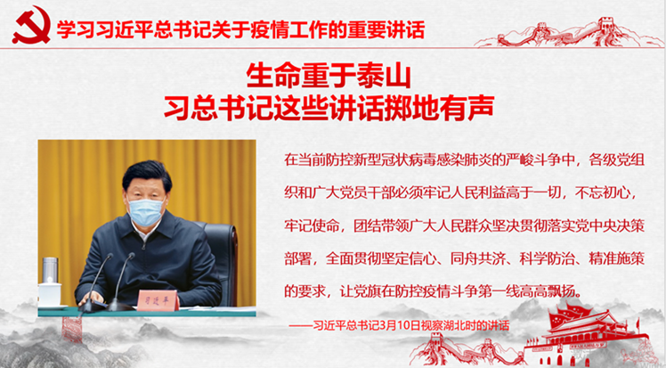 支部成员一起学习讨论了3月10日习近平总书记赴湖北武汉考察新冠肺炎疫情防控工作时的重要讲话。习近平总书记专程到武汉考察疫情防控形势和工作进展,了解武汉人民的困难和需求。总书记强调湖北和武汉疫情防控形势取得阶段性重要成果,但疫情防控任务依然艰巨繁重。继续把疫情防控作为当前头等大事和最重要的工作,毫不放松抓紧抓实抓细各项防控工作,坚决打赢湖北保卫战、武汉保卫战。面对突如其来的疫情,总书记夙兴夜寐,亲自指挥、亲自部署疫情防控这场没有硝烟的战争,充分彰显了身为党和国家领导人的非凡胆略,强烈的使命担当和深厚的人民情怀。支部成员深入学习、深刻领会了总书记的重要讲话,并表示要进一步增强“四个意识”、坚定“四个信心”、做到“两个维护”,坚决贯彻党中央各项决策部署,为夺取疫情防控胜利提供强大的精神支持,更加有力服务党和国家工作大局。