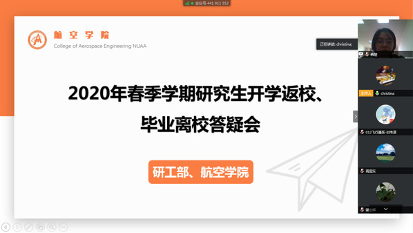 4月15日中午,航空学院召开了2020春季学期研究生开学返校、毕业离校线上答疑会。会议由航空学院团委书记韩楚、研究生辅导员肖秋莹共同主持召开,学院全体兼职辅导员老师及研三、博士班长参加了本次会议。航空学院目前共有1534名研究生参与i南航健康打卡管理(部分在职博士研究生没有计入),其中博士452人,硕士1082人,体量大、种类多,为了更加精准的在线解答硕博学生的问题,本次线上答疑会特意邀请了校研工部张廷赟老师共同参加。