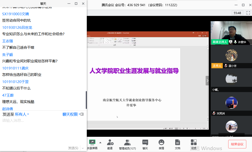 许老师深入浅出地指出了职业定位与选择的重要性,教导同学们应当在大学中不断探索,进行自我检讨、职业试探,找到逐渐具体化的职业偏好,在统整、稳固中以求上进。针对简历制作,许老师建议从求职简历中需要注意的事项入手,提到优秀的简历需要具备的因素与原则:匹配性、可视性、简洁性。谈到如何应对结构化面试,许老师特别指出了许多容易被忽视的细节。线上分享会气氛活跃,最多同时在线人数达到145人,同学们纷纷在聊天区发出弹幕与许老师进行实时交流,表示受益良多。