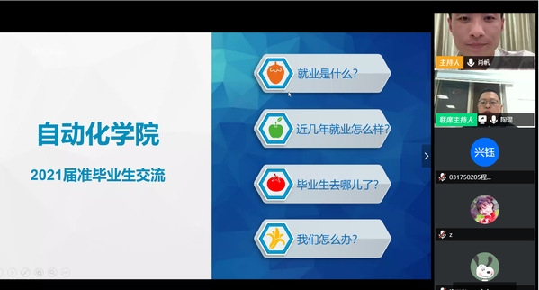 根据前期调研结果,为解答同学们关于就业的相关疑问,自动化学院本科2017级于4月16日开展了第一次就业指导线上讲座。本次讲座邀请了学校就业创业指导服务中心的陶琨老师,本科2017级辅导员肖帆及2017级200余位同学参加了本次讲座。