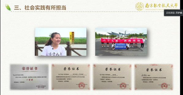 17级曾诗琪同学积极服务他人,作为宿舍长带动宿舍同学积极向上,所在宿舍获得标兵宿舍荣誉称号;报名参加线上难课微讲堂成为一名小讲师,为学习有困难的同学提供学习辅导帮助;在“蓝信封”活动中与留守儿童交流分享,对小朋友的心理疏导效果良好。17级崔璨同学回忆了自己从2016年起踏入南航的每一个历程,从曾经的平平凡凡到如今的不甘平庸,从因身体原因休学到如今的成绩优异,这样的事迹足以用“励志”二字来形容。他说:“我要做一个勇敢的南航追梦人”。从“我与南航的三张名片”出发,学院研究生赵家宁同学阐述了自己的音乐之路,再到直博之路。优秀的人总是勇攀高峰,不论是作为制片人,还是女博士。