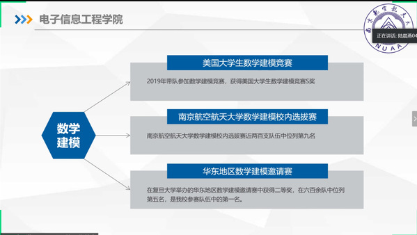 身为校研究生会会长、SX1804第一党支部副书记,华为俱乐部主席的朱娅蒙同学,展示了自己坚持全心全意为广大研究生服务的工作理念和努力完成科研工作的认真态度。张超睿同学分享了作为电子信息工程学院研究生会主席,SX1804学硕一班班长,中兴通讯南京航空航天大学职业发展协会主席的工作日常以及自己的科研学习情况。