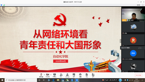 为贯彻中央《关于加强党的领导、为打赢疫情防控阻击战提供坚强政治保证的通知》和《新时代爱国主义教育实施纲要》精神,发挥学生党员先锋模范作用,认真学习新冠肺炎疫情防控“大课”,涵育新时代爱国主义精神、坚定爱国力行使命责任,4月21日,自动化学院本科2018、2019级联合党支部开展了一次线上“微党课”,从网络环境看青年责任和大国形象。