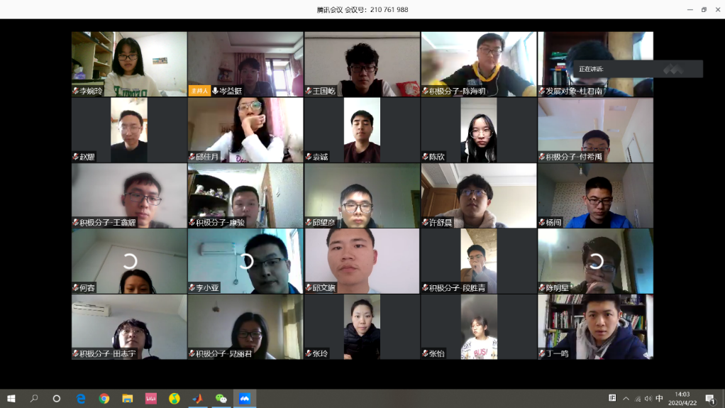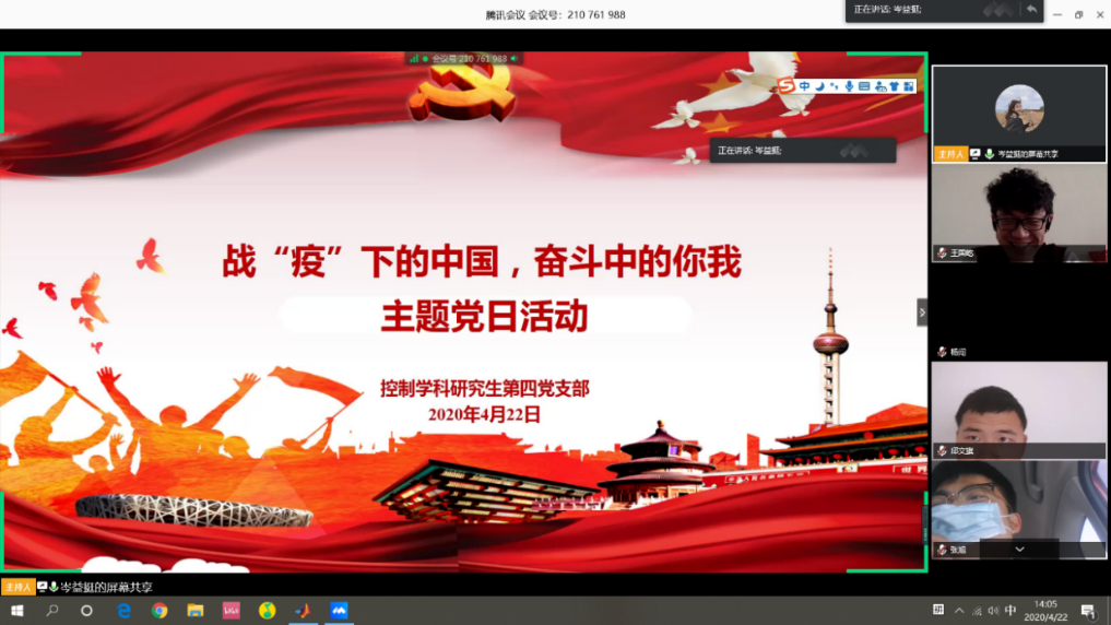 为贯彻中共中央《关于加强党的领导、为打赢疫情防控阻击战提供坚强政治保证的通知》和《新时代爱国主义教育实施纲要》精神,带动学生党员认真学习新冠肺炎疫情防控“大课”,发挥党员先锋模范作用,2020年4月22日下午,自动化学院控制学科研究生第四党支部开展了一场以“战‘疫’下的中国,奋斗中的你我”为主题的线上党日活动,支部党员、发展对象、积极分子共计41人参加了本次活动。该党支部由自动化学院教职工张玲老师担任支部书记,本次活动参与人员均为导航研究中心研究生。