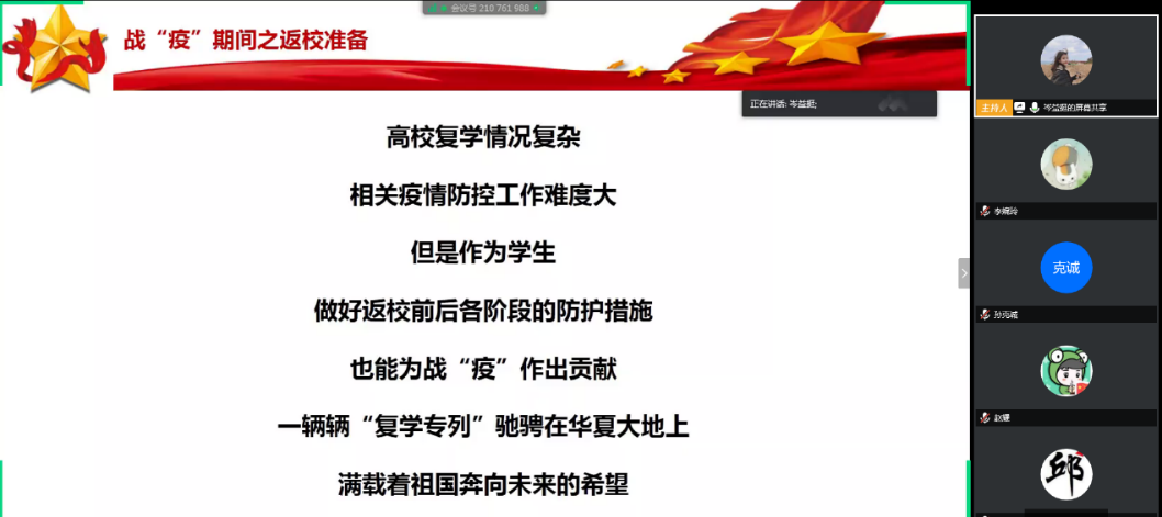最后,考虑到研究生同学们即将陆续返校,岑益挺同志提醒支部成员在返校前后的各个阶段做好自我防护措施,对战“疫”工作做出力所能及的贡献。