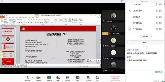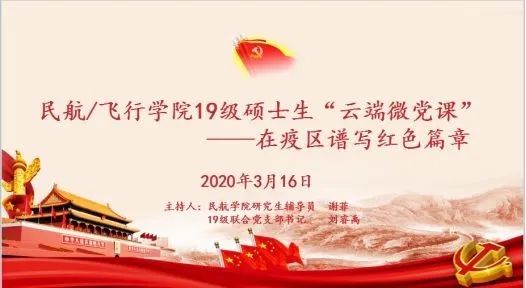 由民航学院19级研究生联合党支部与院机关党支部共同举办的“云党课”——《在疫区谱写红色篇章》,刘辉、郁翔、侯美丽、谢菲老师与屏幕前的93名党员、积极分子共同分享、传递力量,让党的声音传播到每一位听众的心里。两位家在湖北的学生党员杨爱文和彭梓晗分享了他们在“疫情”期间的所见所感;研究生党员陈波宇分享了属于他的红色日记;院机关党支部侯美丽从党、国家与自身的角度提出了建议和思考。
