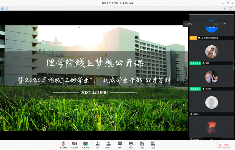 4月19日,理学院梦想公开课暨2020年省级“三好学生”、“优秀学生干部”公开答辩会在线上举行,理学院党委副书记方正,副院长李晋斌,数学系系主任,物理系系主任,各学科教师代表,各年级辅导员担任评委,各年级学生通过网络直播平台观看了答辩会。