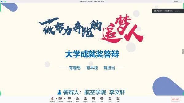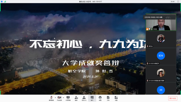 4月30日下午,航空学院2020届本科生“大学成就奖”、“优秀毕业生”院内答辩评审会在线上会议室举行。航空学院全体辅导员,班主任老师尚闫、郭玉杰、陈维建、韩东参加评审,评审会由焦安康主持。