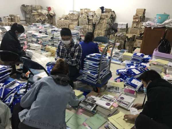 为保证教材寄送过程中的防疫安全,教务处按疫情防控要求每天在教材发行站完成早中晚三次消杀工作,严格遵循学校疫情防控领导小组要求,完成供应商人员进校的申请审批和健康证明存档等工作。为最大程度地避免寄送过程中容易出现的差错,教务处优化寄送流程,教材科老师协同熟悉教材情况的供应商进行拆包、分拣、核对、装袋、打包、贴单、转运、邮寄,并实行订单分配到人的登记责任制。