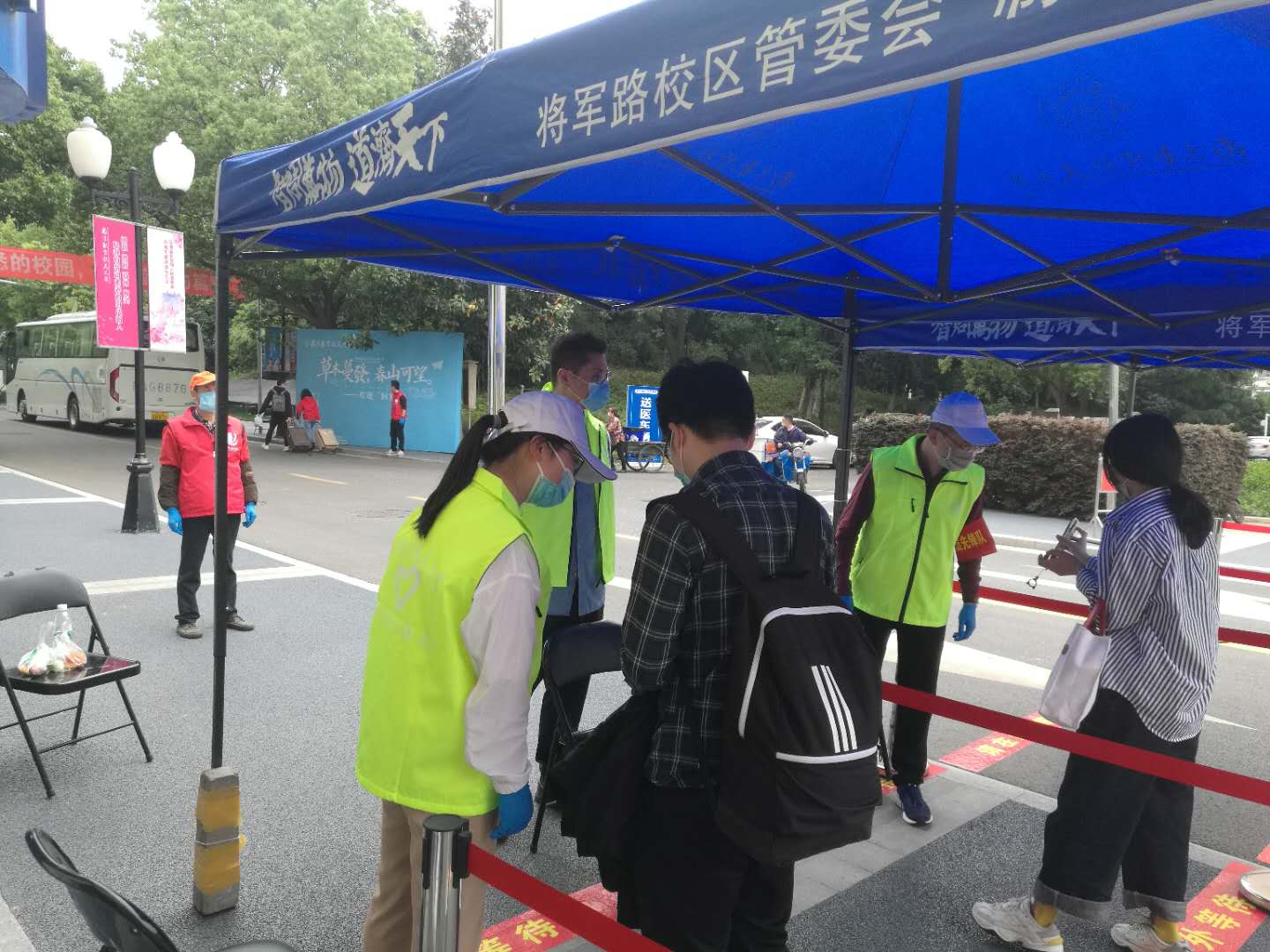 志愿服务招募通知发布后,学院教师踊跃报名,最后由法律系、公共管理系及机关三个教工党支部共12名党员联合组成了一支志愿服务小分队。小分队成员利用休息时间参加了志愿服务培训,并主要负责中午1:30到晚上8:00时间段内,将军路校区北门与大西门两个区域学生们体温检测与健康码核验工作。除了指定志愿工作外,党员教师们还主动帮助学生推运行李,引导学生前往校车集中点乘坐运送车,并耐心解答返校学生的各类问题。