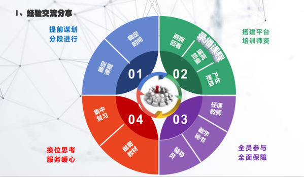 赵宇从提前谋划、分段进行,搭建平台、培训师资,全员参与、全面保障,换位思考、服务暖心四个方面介绍了学院线上教学的经验。