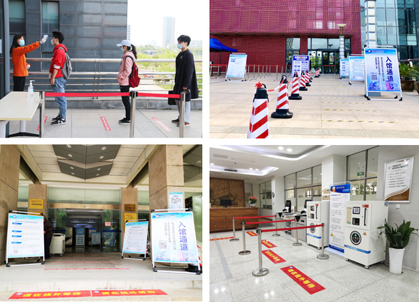 为保障入馆读者的健康安全,图书馆在开馆前根据国家相关防控指导意见,组织人员测算可用空间,进行位置测量,科学有序设置阅览座位,严格控制座位距离、各楼层人数以及开放区域。通过微信端入馆预约平台授权进出,控制同时在馆人数,入座后扫描桌上二维码登记,保证入馆人员信息可追溯。购买图书杀菌机、红外测温仪等设备,张贴提醒标识和注意事项,设置一米线,做好服务区域划分。根据疫情防控要求,结合不同校区工作实际,开展模拟演练,磨合各项安全措施,稳步恢复开放馆舍,提供读者服务。做好防疫管理工作,在入馆处设立温度检测区,布置隔离带,保证出入馆人流不交叉,在入馆通道、自助设备旁配备免洗洗手液,各楼层洗手间均配备洗手液供读者使用,做好每日消毒和馆内通风换气,对归还图书进行消毒后上架。通过图书馆网站、微信公众号、宣传栏、展板、电子屏等,宣传推送疫情防控信息,教育、引导读者和员工加强自我防护。