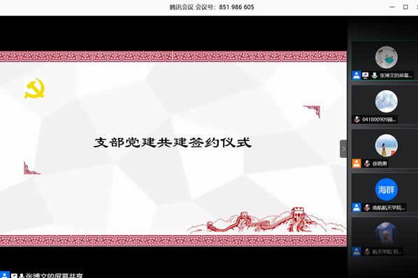 随后,党建共建签约仪式正式开始。三个支部的党支部书记同时签署共建协议。与会的所有学院领导、老师打开摄像头,以云合影的方式记录下了这个难忘的时刻。签约仪式过后,聂东林发表讲话,总结了学院的发展历程,同时表达了对微波光子学实验室纵向党支部的祝愿,希望党支部在自身前进的同时与其他高校的优秀党支部共同学习和进步。季海群着重介绍了航天思政工作法体系,希望三个党支部在接下来的党建工作中传承航天精神,深化思政教育,弘扬匠心文化。金德鹏在讲话中强调,要将学科建设和人才培养与国家发展建设相结合,贯彻“为党育人、为国育才”的理念,将支部共建活动打造成一块亮丽的品牌。
