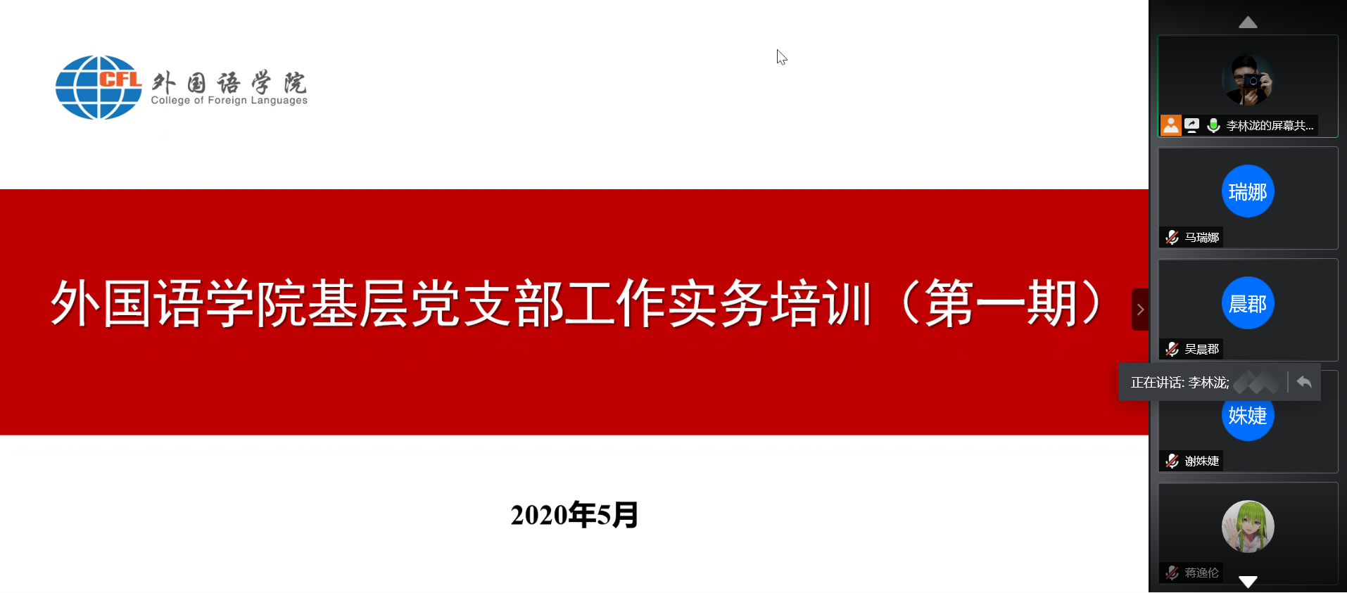 为了加强学院基层党支部书记的思想政治素养和党建业务能力,促进基层党支部建设的规范化和标准化,外国语学院党委邀请我校组织部的谢姝婕老师为全院基层党支部书记、学生工作人员开展党支部工作实务的培训。学院党委副书记梁薇出席,培训在线上进行,由学院组织员李林泷主持。