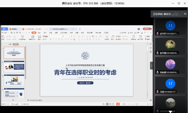 5月25日晚19:00,第七期“人文青年说”优秀院友分享会在腾讯会议平台如期举行,本期分享会邀请到了优秀院友——唐志文老师。唐志文是我院2012届思想政治教育专业优秀硕士毕业生,现任南航校团委办公室主任,他从事多年学生思想政治教育工作、学生培养工作,有着丰富的学生工作经验。本期分享会,唐志文以“青年在选择职业时的考虑”为主题,从“选择”的角度为同学们剖析青年在选择职业时应有的考量。
