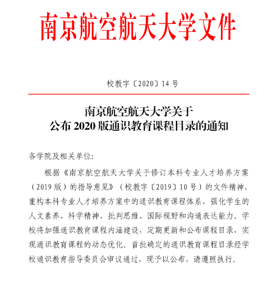 近日,《南京航空航天大学关于公布2020版通识教育课程目录的通知》(校教字[2020]14号)正式发布,标志着我校通识教育改革进入了新阶段。