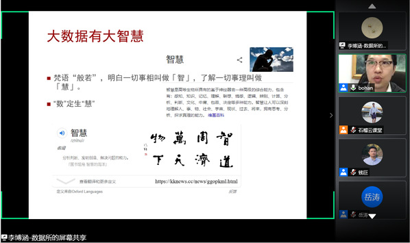 最后,李博涵从理解数据开始、到让数据开口说话、再到用数赋智,深入浅出地描述了大数据的发展历程,帮助同学们理解数据的重要性、了解大数据的分析方法。针对快乐学术研究方法的话题,他建议同学们要培养良好的编程素养、数学素养,掌握克服拖延症、优化时间管理的能力与智慧,激励同学们“Enjoy the pain”,真正做到勤勉学术、快乐科研。