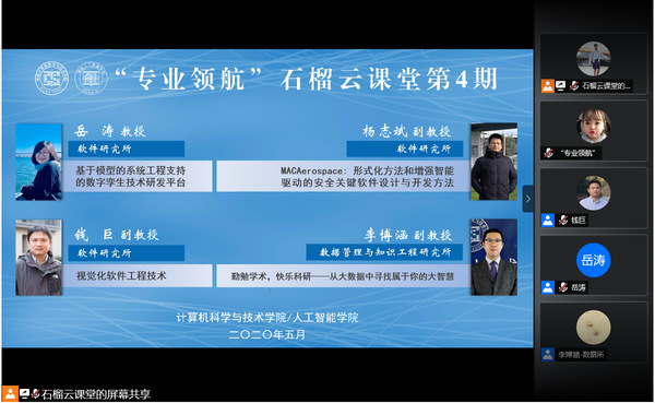 5月29日晚,计算机科学与技术学院/人工智能学院成功举办第四期“专业领航”石榴云课堂,学院软件研究所的岳涛、钱巨、杨志斌和数据管理与知识工程研究所的李博涵四位老师精彩开讲,吸引了近200名学生参与其中。本期云课堂由岳涛、李博涵主持。