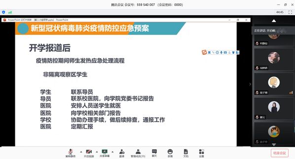 井岩峰同志围绕学校在疫情防控期间发布的三项通知——《关于严明新学期开学及“三节”期间疫情防控和纪律要求的通知》、《关于发布<新型肺炎疫情防控相关防控技术指南>的通知》、《关于发布<新型冠状病毒肺炎疫情防控应急预案>的通知》,具体阐述了学校在此次疫情防控期间的工作部署和有效措施,让支部党员体会到了全校师生心往一处想、劲往一处使,齐心合力抗击疫情的力量,他还倡导我们学生党员在疫情防控期间尽己可能发挥党员的带头作用,为抗击疫情尽一份绵薄之力。