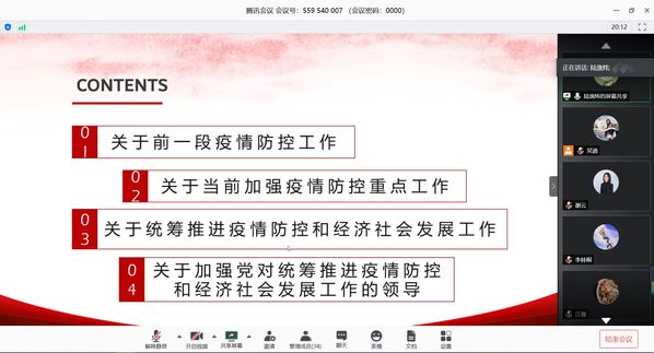 第二期“云端”理论学习主要以新冠肺炎疫情防控及党支部工作实务与思考为主题,以学生党员个人自学、支部小组领学、互动交流等形式开展。在前期党员个人自学的基础上,此次党支部集中学习首先由赖欣、陆逸炜同志带领大家学习了习近平总书记在统筹推进新冠肺炎疫情防控和经济社会发展工作部署会议上的讲话,并就讲话重点内容进行深入分析,总结了在疫情防控期间党和国家所作的努力,号召支部党员共同努力,抱着必胜的信心参与疫情防控工作。