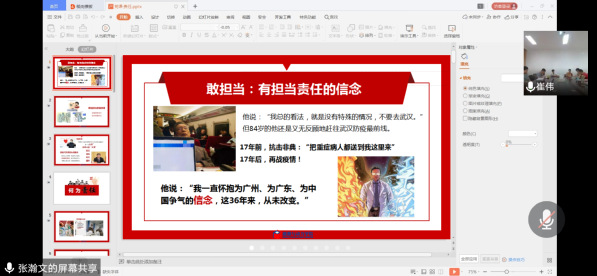 活动伊始,张瀚文为两个支部带来了一堂以“你担当的样子真美”为主题的线上微党课。微党课中,张瀚文以疫情期间两个支部成员的抗“疫”事迹为切入,鼓励党员要“敢担当,有担当的信念”、“会担当,有担当的本领”、“能担当,有担当的行动”,要牢记习总书记对青年的嘱托,为祖国航空发动机事业的蓬勃发展而努力奋斗!