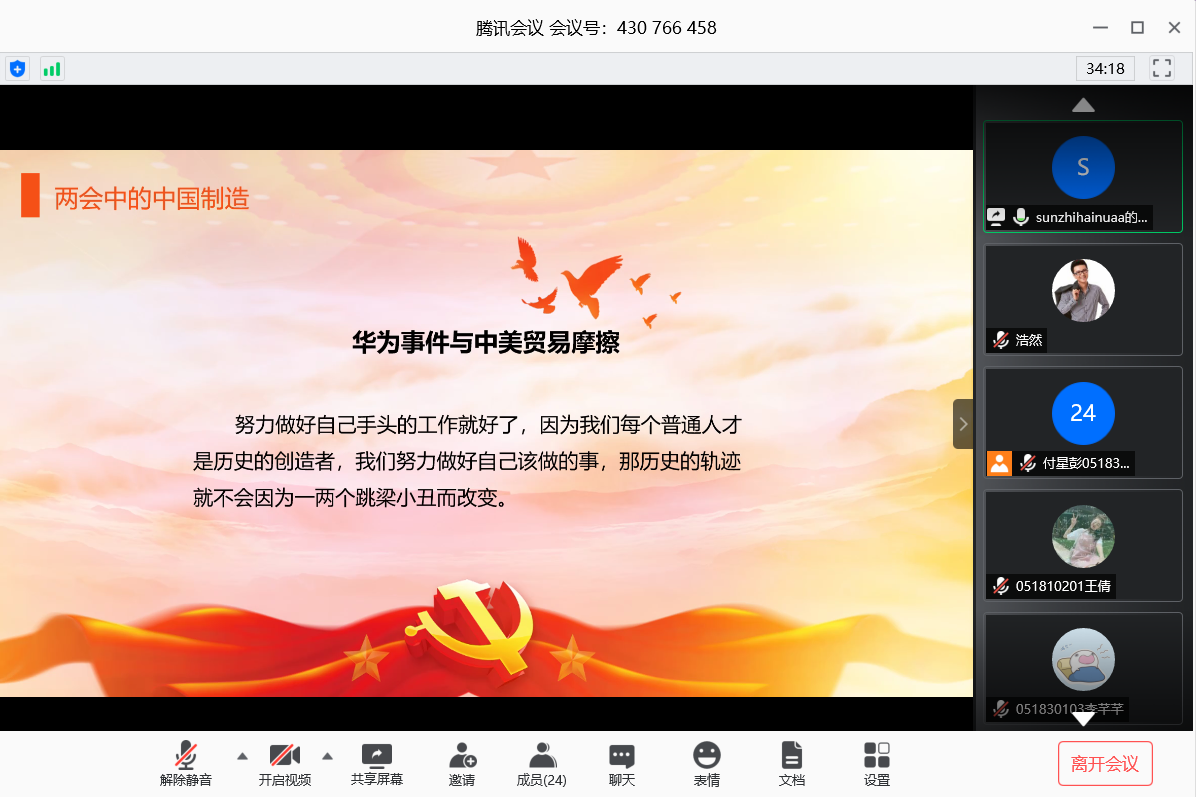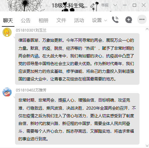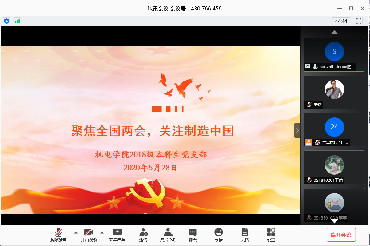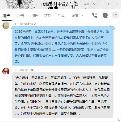 在本次活动的第二个环节,支部成员结合专业实际就“两会”学习感悟进行了线上分享交流,支部成员纷纷表示,作为即将投身制造行业的新时代大学生,我们要牢记初心使命,主动承担社会责任,勤奋求学、积极创新,为早日实现中国制造2025与中华民族伟大复兴贡献青春力量!