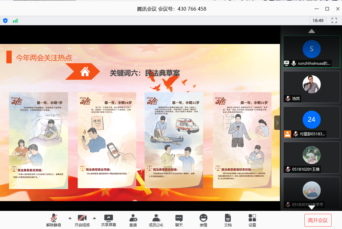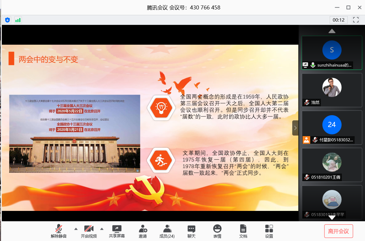 接下来,孙志海从“全国两会”中的变与不变两个方面讲述了今年不同寻常的“两会”。受新冠肺炎疫情影响,今年“两会”的会期、议题、形式均发生了明显变化,但是中国人民共克时艰的信心、构建人类命运共同体的决心、通民情、汇民智、解民忧的初心坚定不变。同时,他从经济运行、全面小康、公共卫生、国际合作、对外关系、民法典草案等关键词出发,逐次展开介绍了今年“两会”备受关注的社会热点,特别是如何在疫情影响下全面建成小康社会以及中国首部以法典命名的民法典草案诞生的背景和历程。