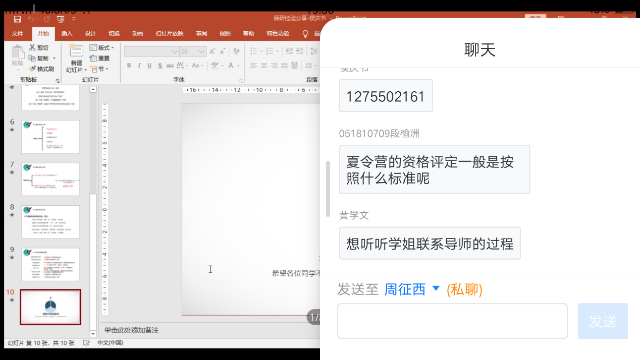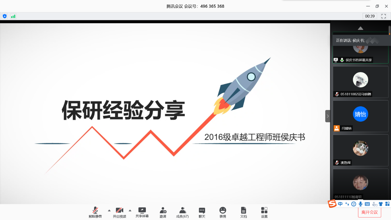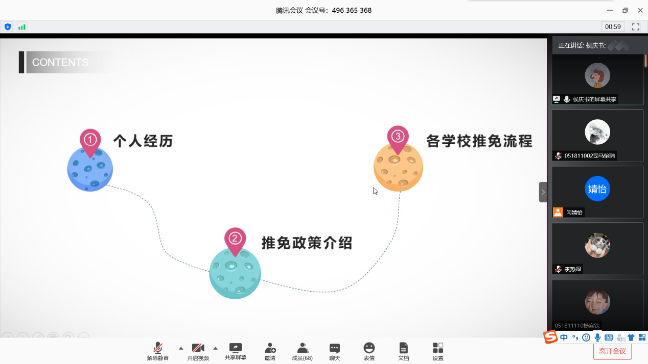 侯庆书同学分别从个人学习经历、相关保研政策解读以及部分高校推免流程三个方面进行了分享。谈到学习经历,她用实际行动证明在大学期间无论何时努力都不会晚,她的平均学分绩点从大一学年的3.3到大三学年的4.0,最终以3.9的绩点成功获得保研资格。在保研政策方面,她重点介绍了保研绩点的计算方法以及本科前三学年适合大家参加的科创比赛,特别强调联系指导老师的重要性,在获得科创竞赛指导的同时,能够提前接触研究生课题研究,而这将为接下来的研究生方向选择提供重要参考依据。