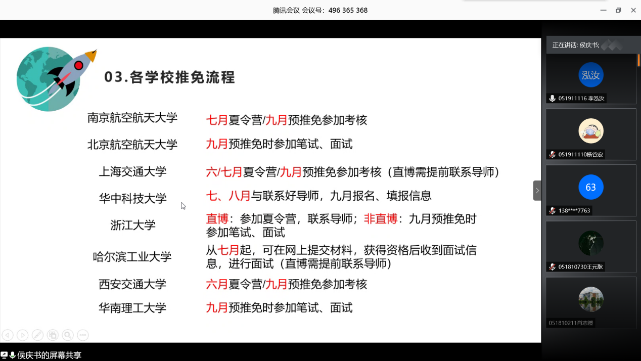 最后,她结合身边同学的保研经历为大家介绍了部分高校推免流程,在讲到大家比较关心的保内还是保外的问题时,她建议大家根据自身实际选择保研高校,保研至清北等名牌高校虽然为我们提供了不一样的平台,但是务必确保了解未来的研究方向及导师情况,得益于本校生的身份,保研本校具有提前联系导师和深入研究课题的优势,在条件允许的情况下,研究生学习生涯合理前置,将有助于大家在本科及接下来学习中研究出更多的理论成果。
