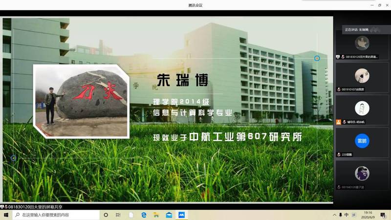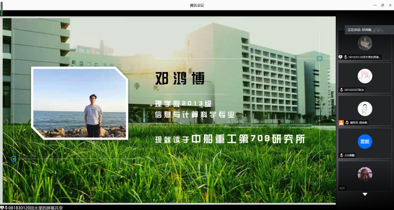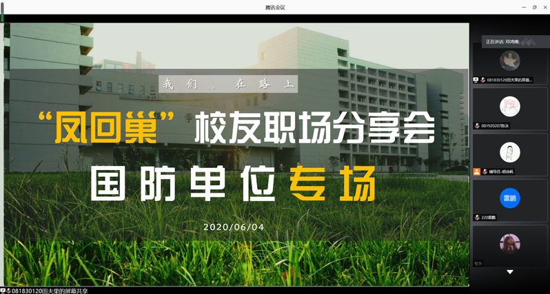 6月9日,理学院“凤回巢”校友职场说讲座——国防单位专场于线上开展。现就读于中船重工第709研究所的理学院13级校友邓鸿博与就职于中航工业第607研究所的14级校友朱瑞博受邀参与了本次活动。