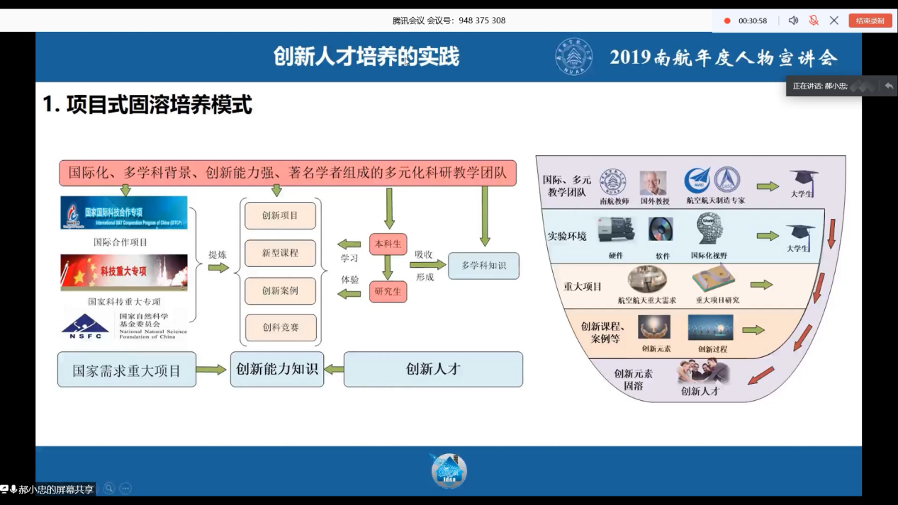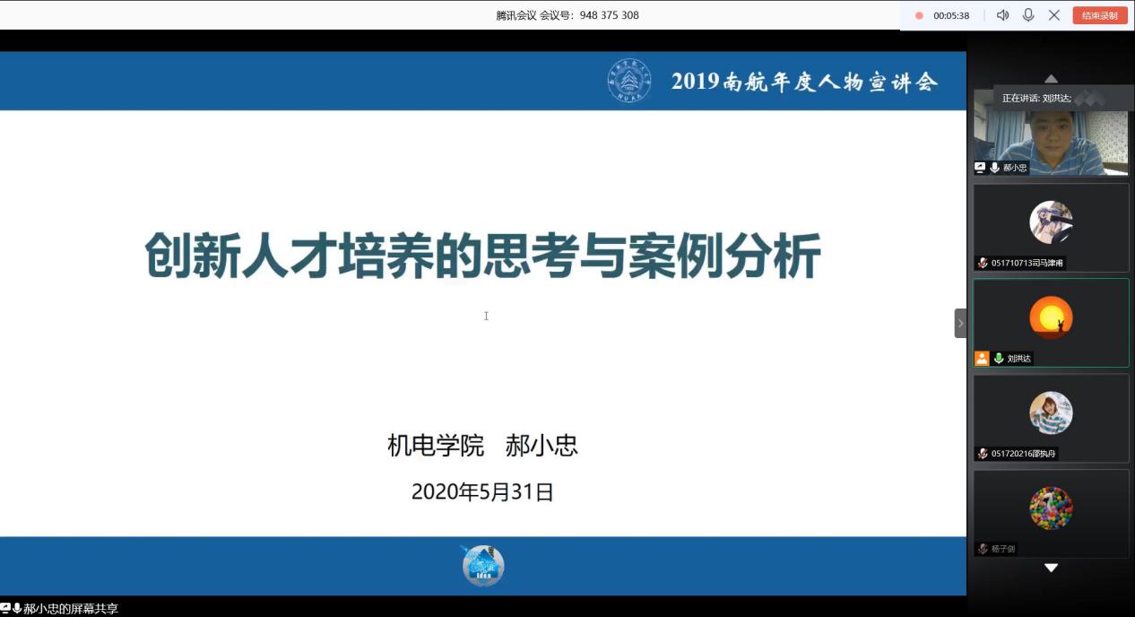 为了加强和改进新时代师德师风建设、加快构建高校思想政治工作体系的精神,充分发挥榜样的引领示范和辐射带动作用,5月31日晚,机电学院邀请“2019南航年度人物”郝小忠走进学院,与青年学生分享个人事迹与成长感悟,充分发挥身边典型的引领示范作用。学院党委副书记徐俊珠、2017级本科生辅导员和超过300名本科生聆听本次线上宣讲。