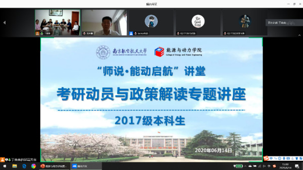 6月14日,能源与动力学院“师说·能动启航”讲堂第九讲通过腾讯会议软件,以线上直播的方式顺利开讲。本次讲座以“2021届毕业生考研动员与政策解读”为主题,能源与动力学院副院长徐惊雷、党委副书记王霄、各系教师代表、学生工作人员及2017级300余名本科生共同参加,讲座由王霄主持。