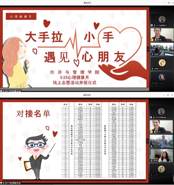 为缓解后疫情时期学生居家的焦虑情绪,经管学院联合甘肃省陇南成县下五郎小学开展“大手拉小手 遇见心朋友”线上志愿活动, 6月16日下午举办开班仪式。学院心理辅导员胡心雨、甘肃省陇南市成县黄陈镇下五郎小学班主任汪均剑以及来自经管学院、下五郎小学的百余位学生参加活动。