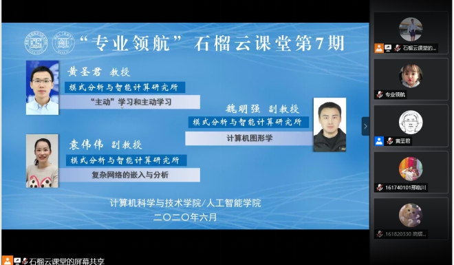 6月19日晚,计算机科学与技术学院/人工智能学院成功举办第七期“专业领航”石榴云课堂,学院模式分析与智能计算研究所的黄圣君、袁伟伟和魏明强三位老师为近200名本科生云端领航。本期云课堂由黄圣君主持。